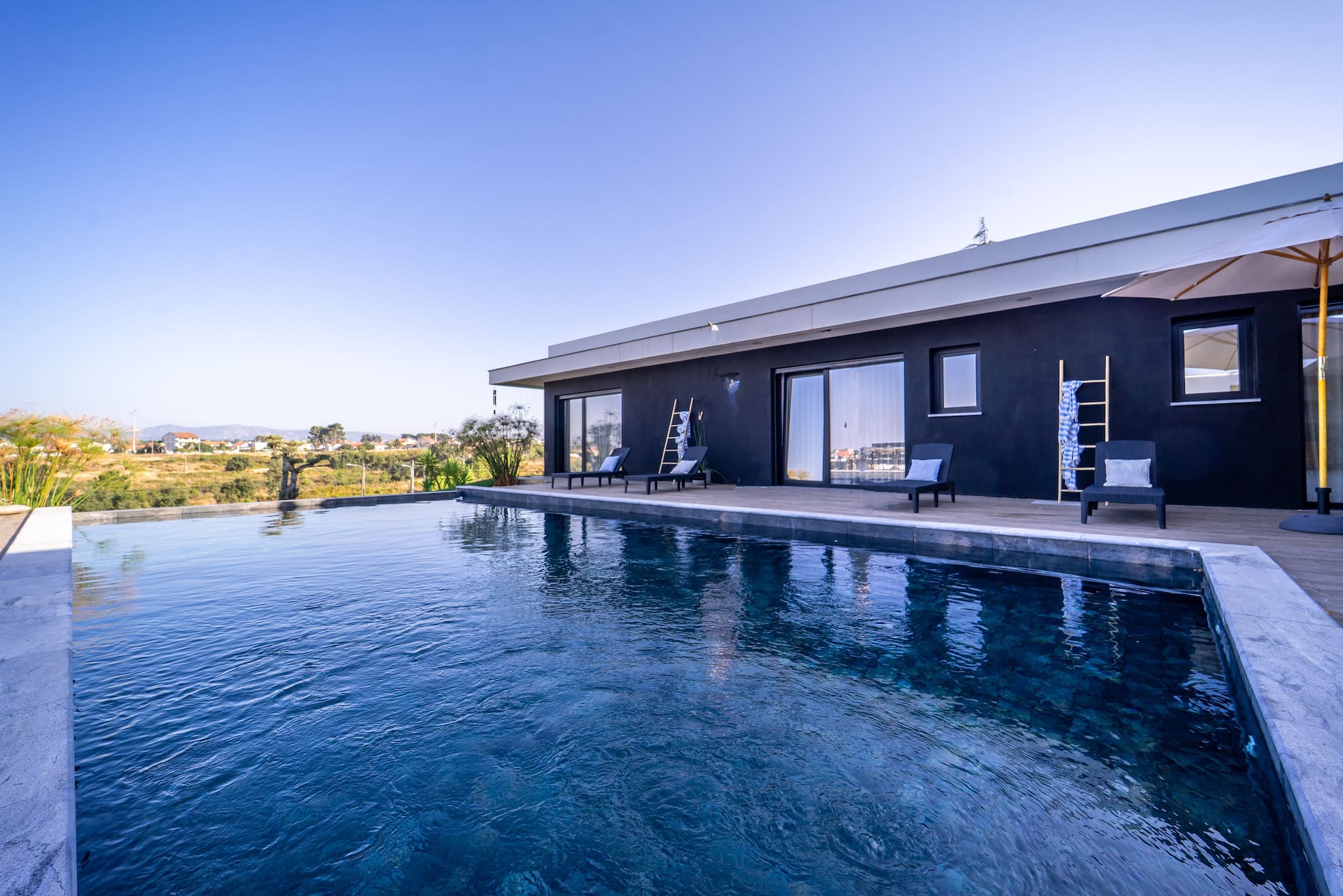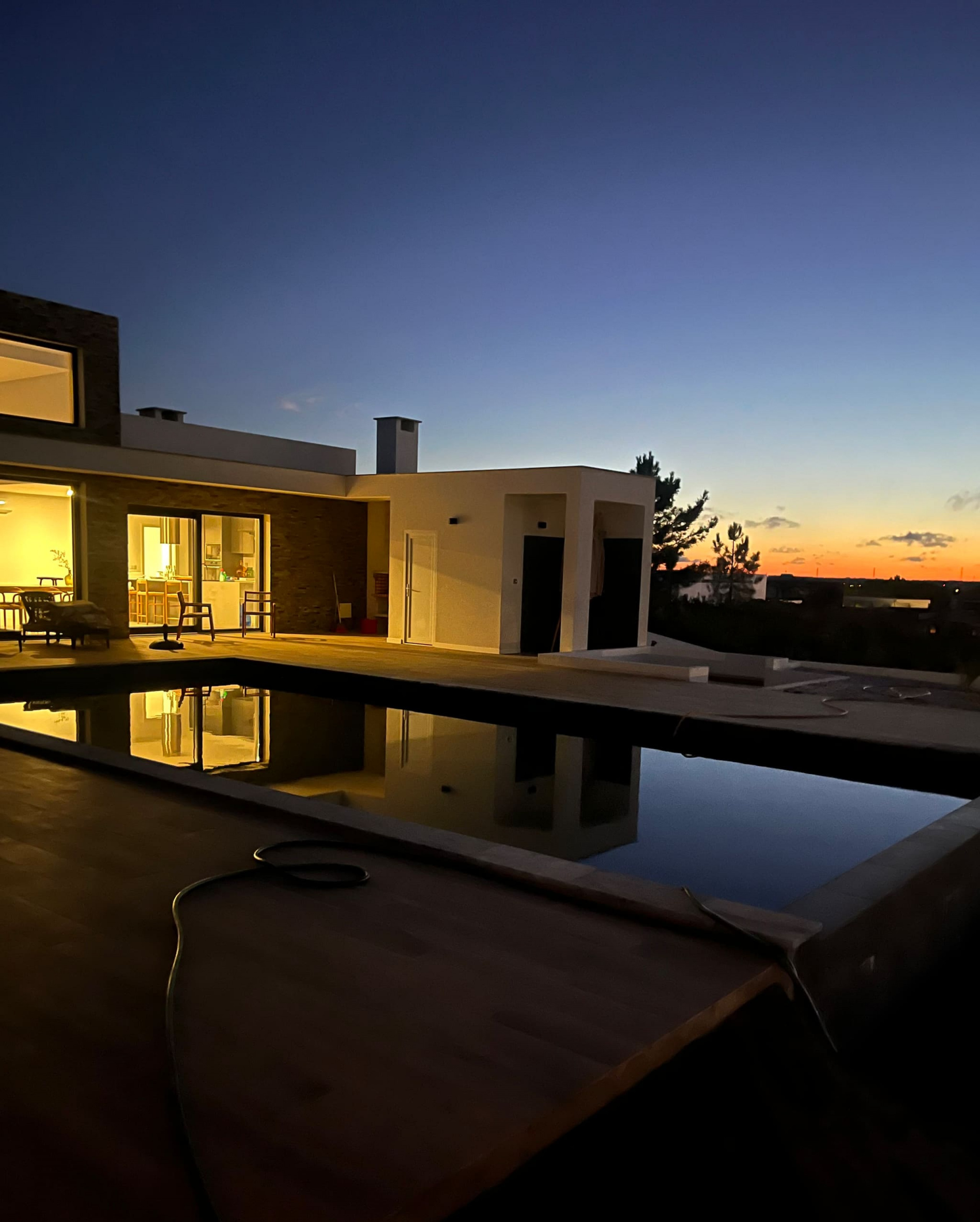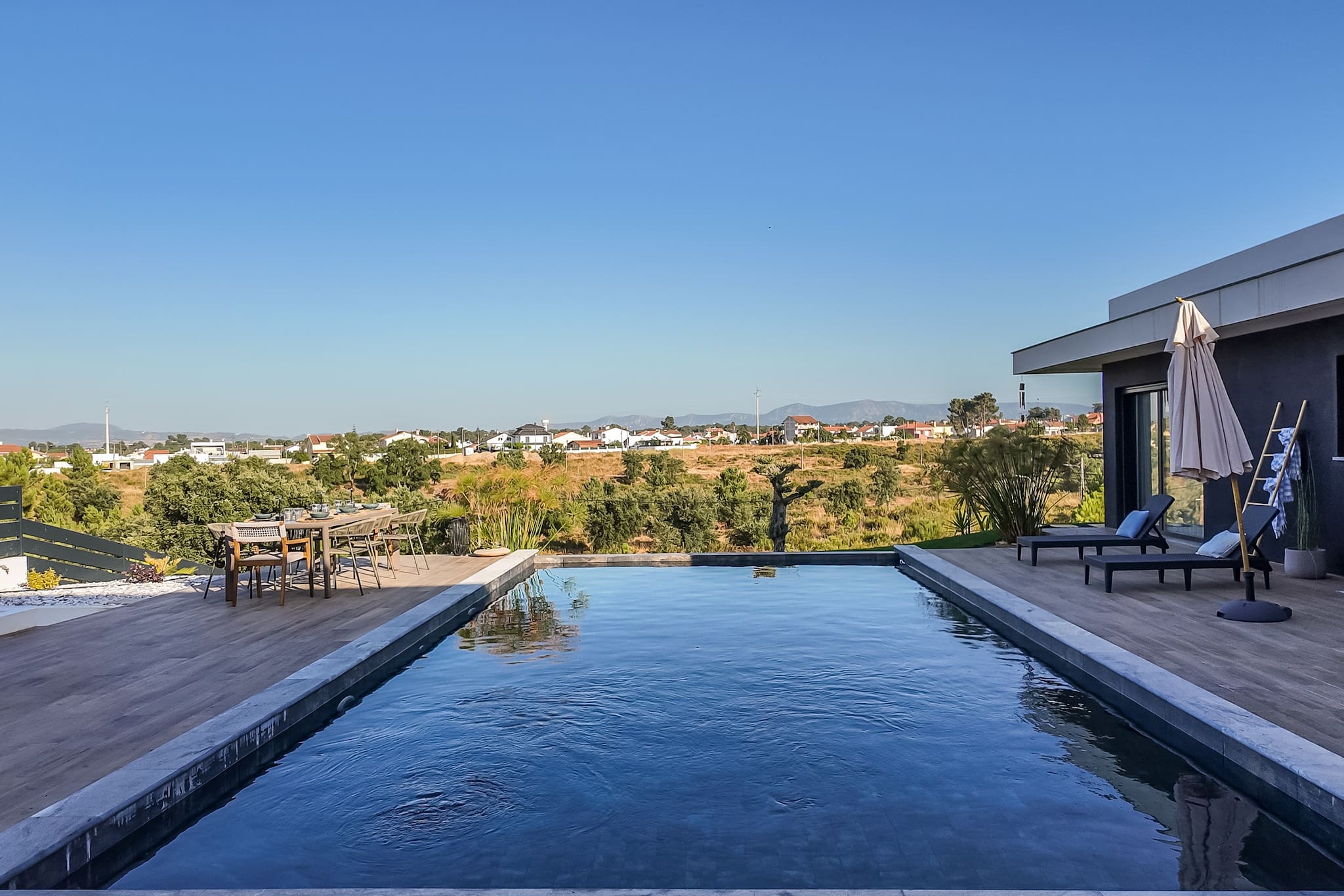 Piscina. Mergulhe no relaxamento na nossa piscina cintilante, cercada pelo pátio beijado pelo sol e vegetação exuberante, enquanto desfruta da vista das montanhas Arrabida à distância.