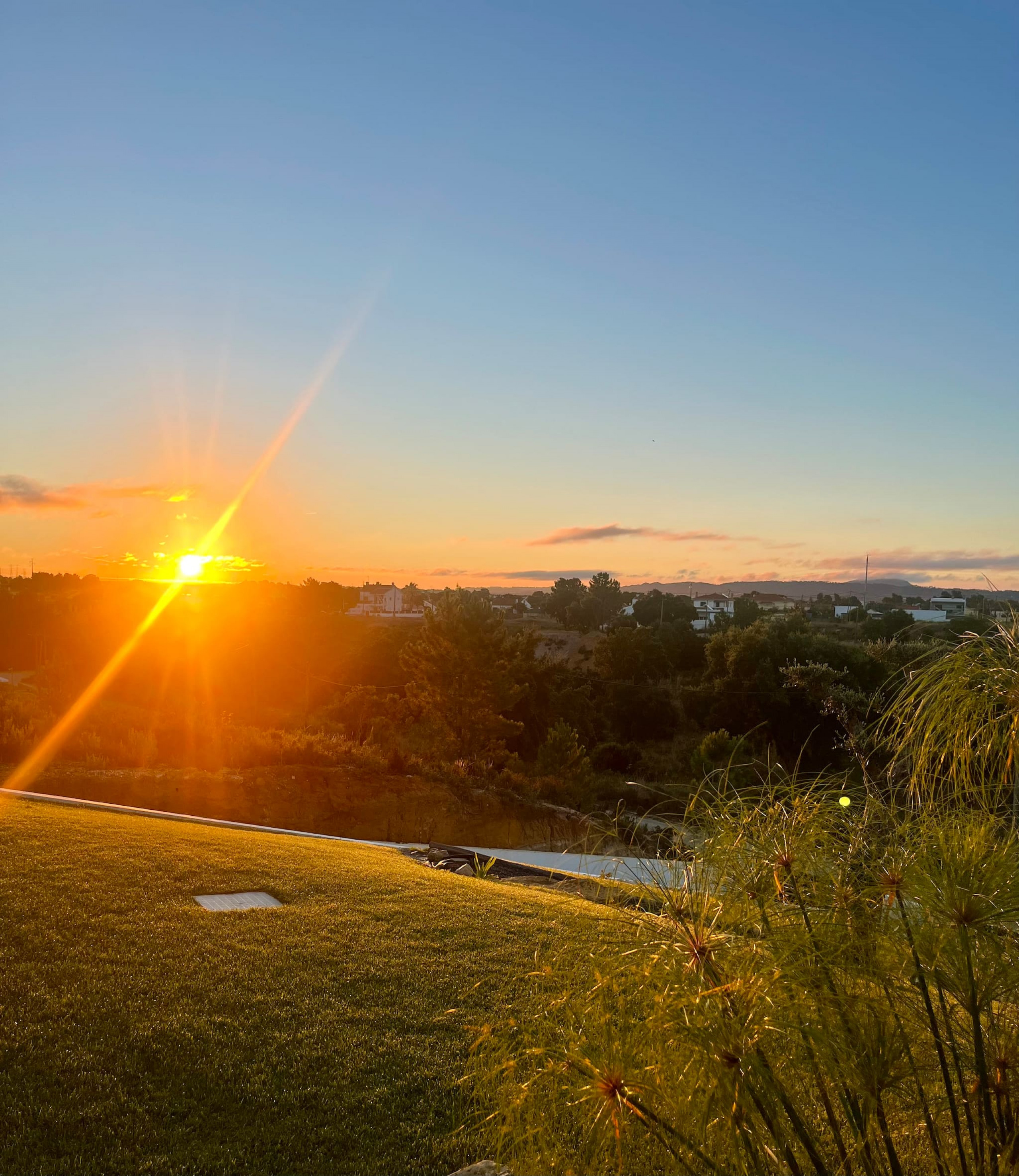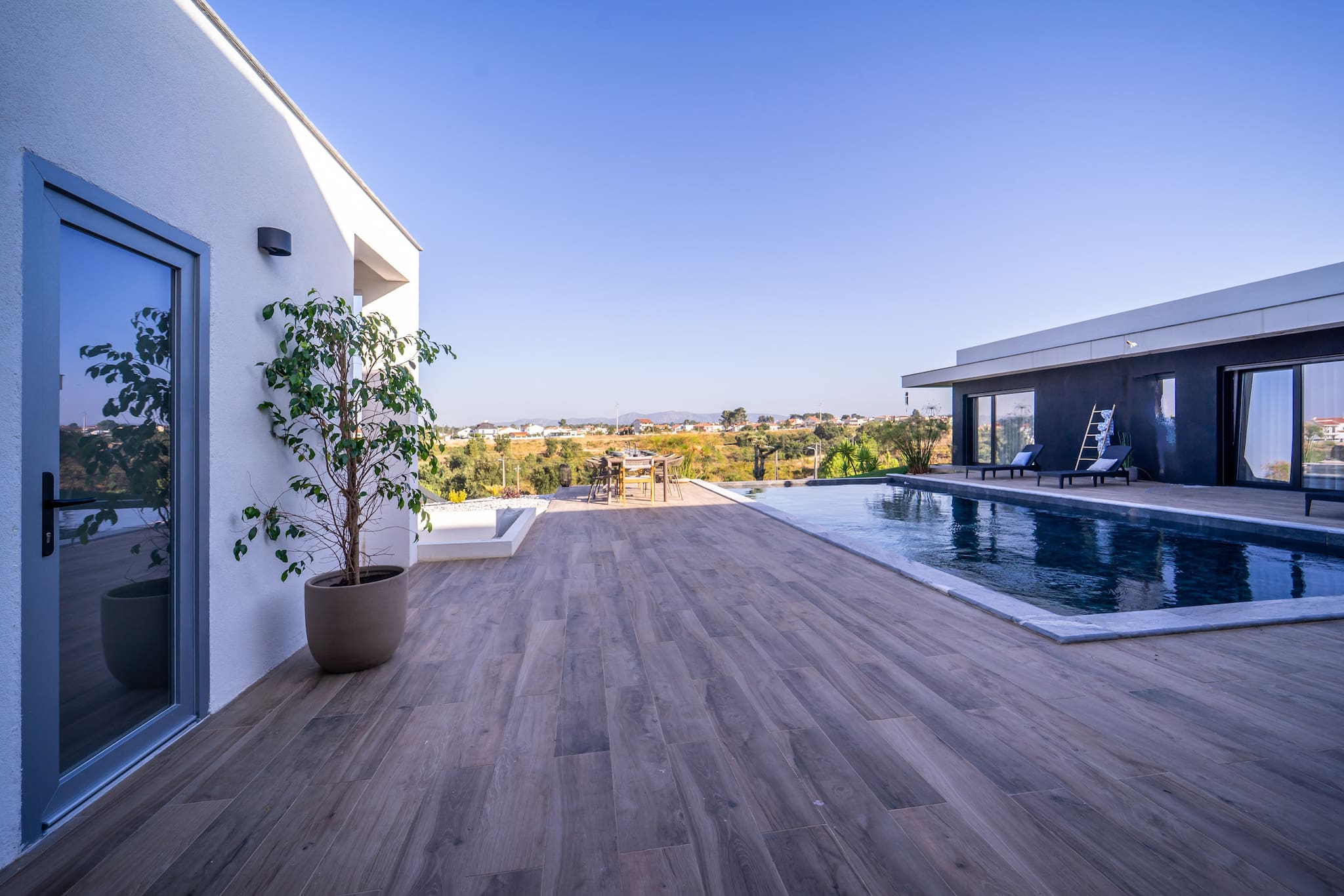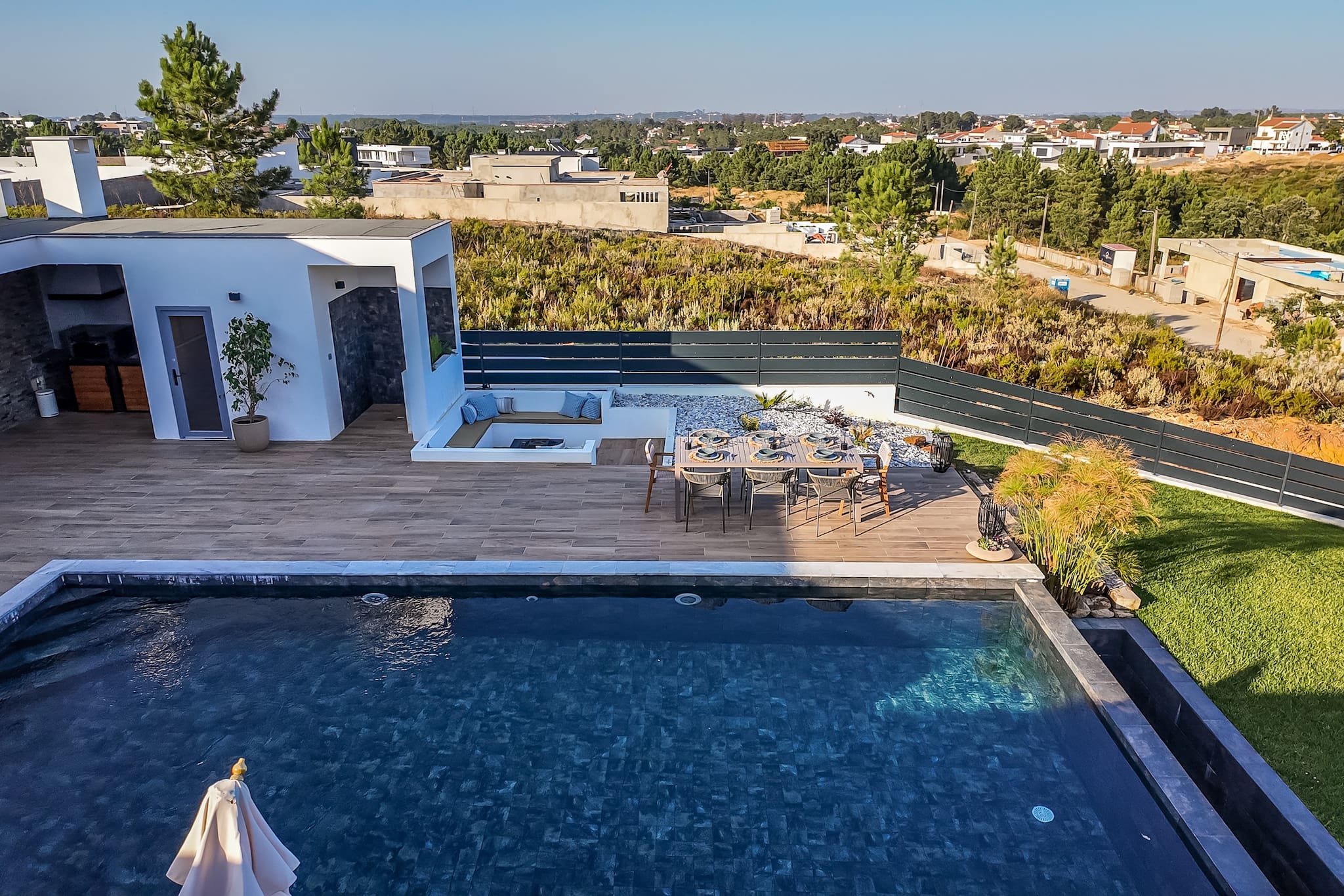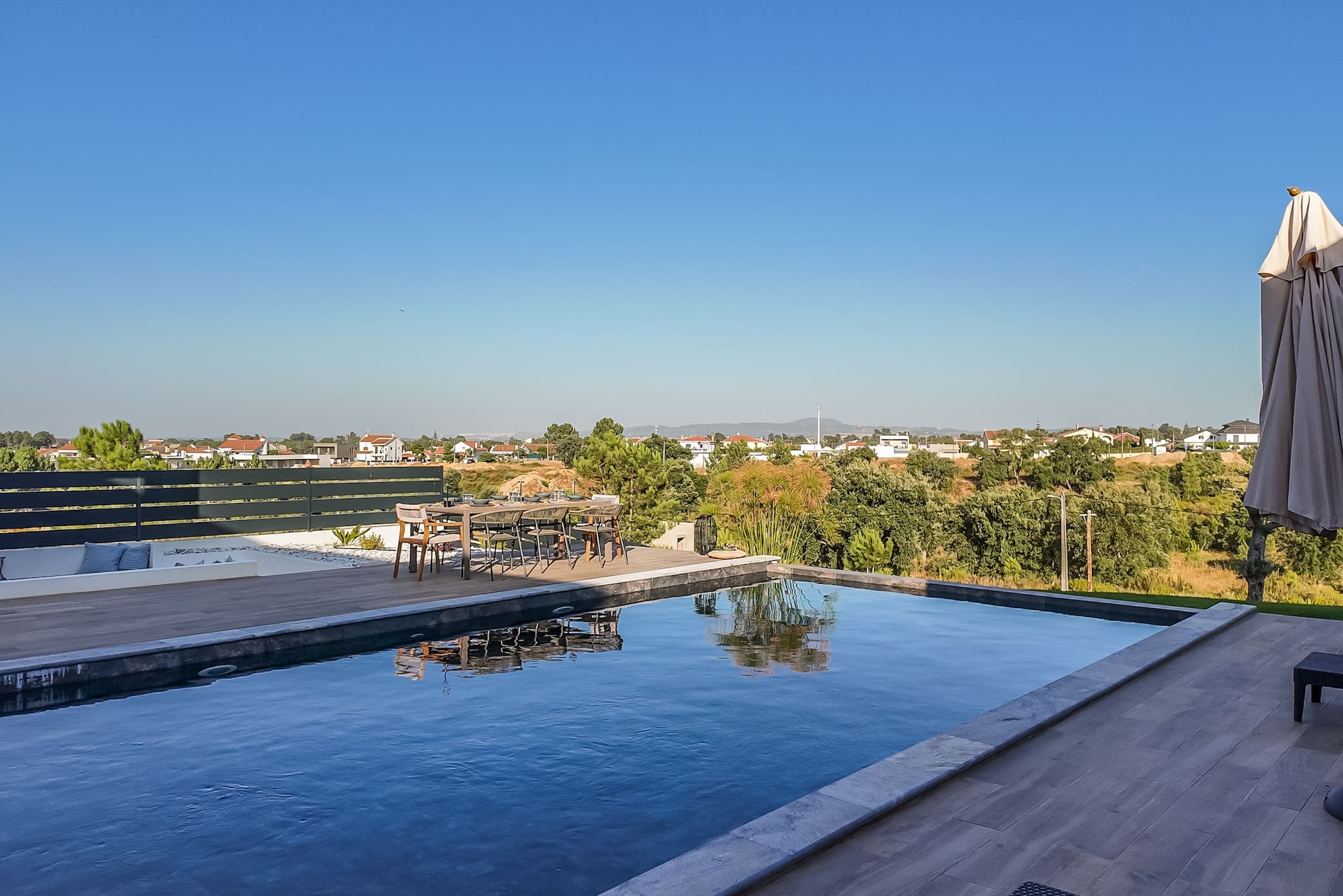 Piscina. Mergulhe no relaxamento na nossa piscina cintilante, cercada pelo pátio beijado pelo sol e vegetação exuberante, enquanto desfruta da vista das montanhas Arrabida à distância.
