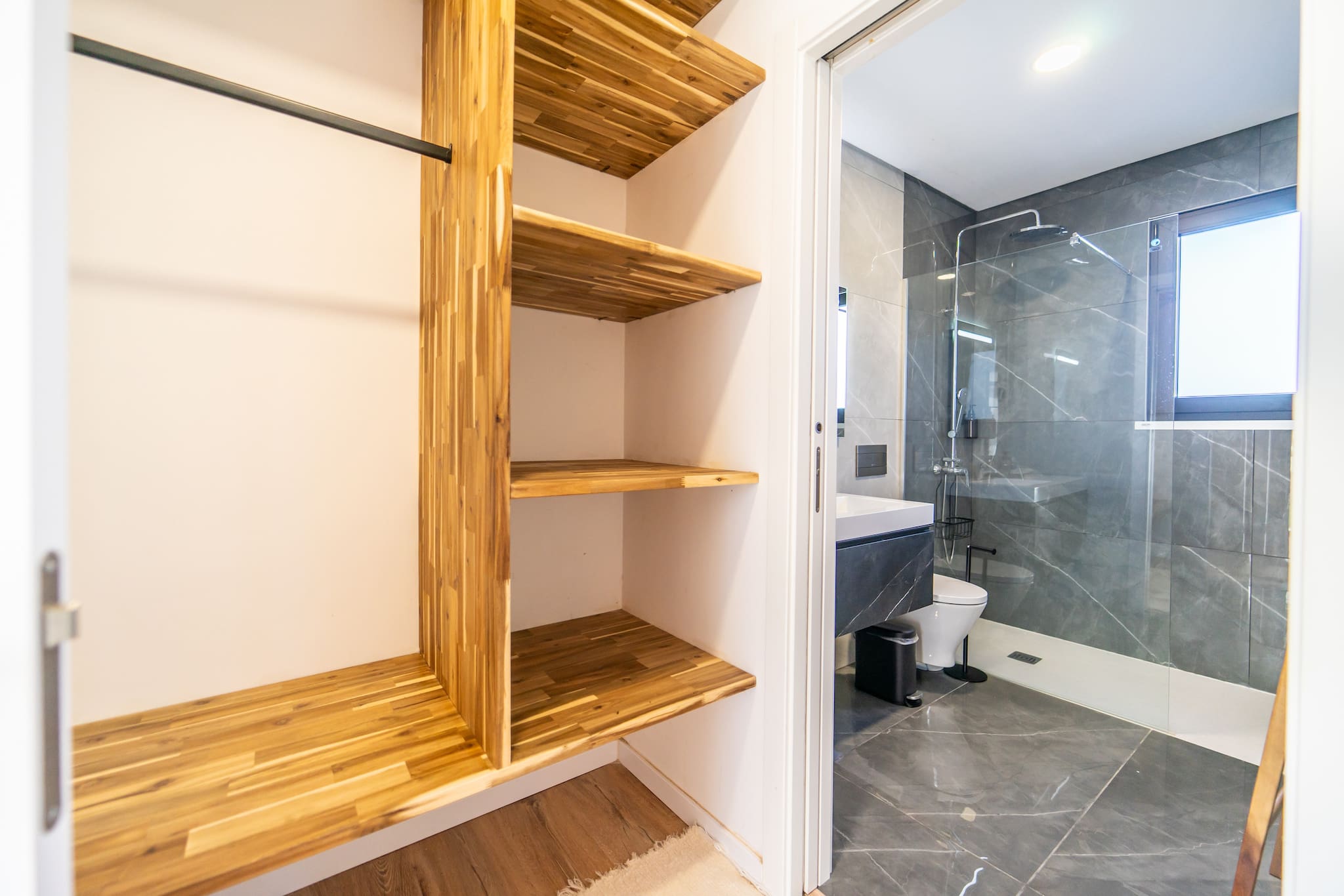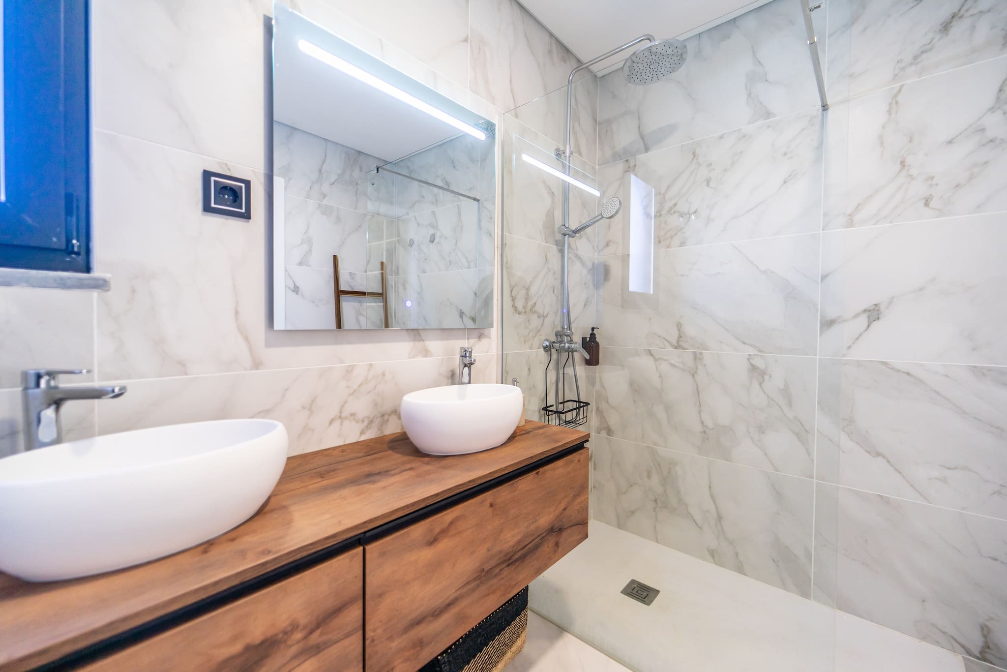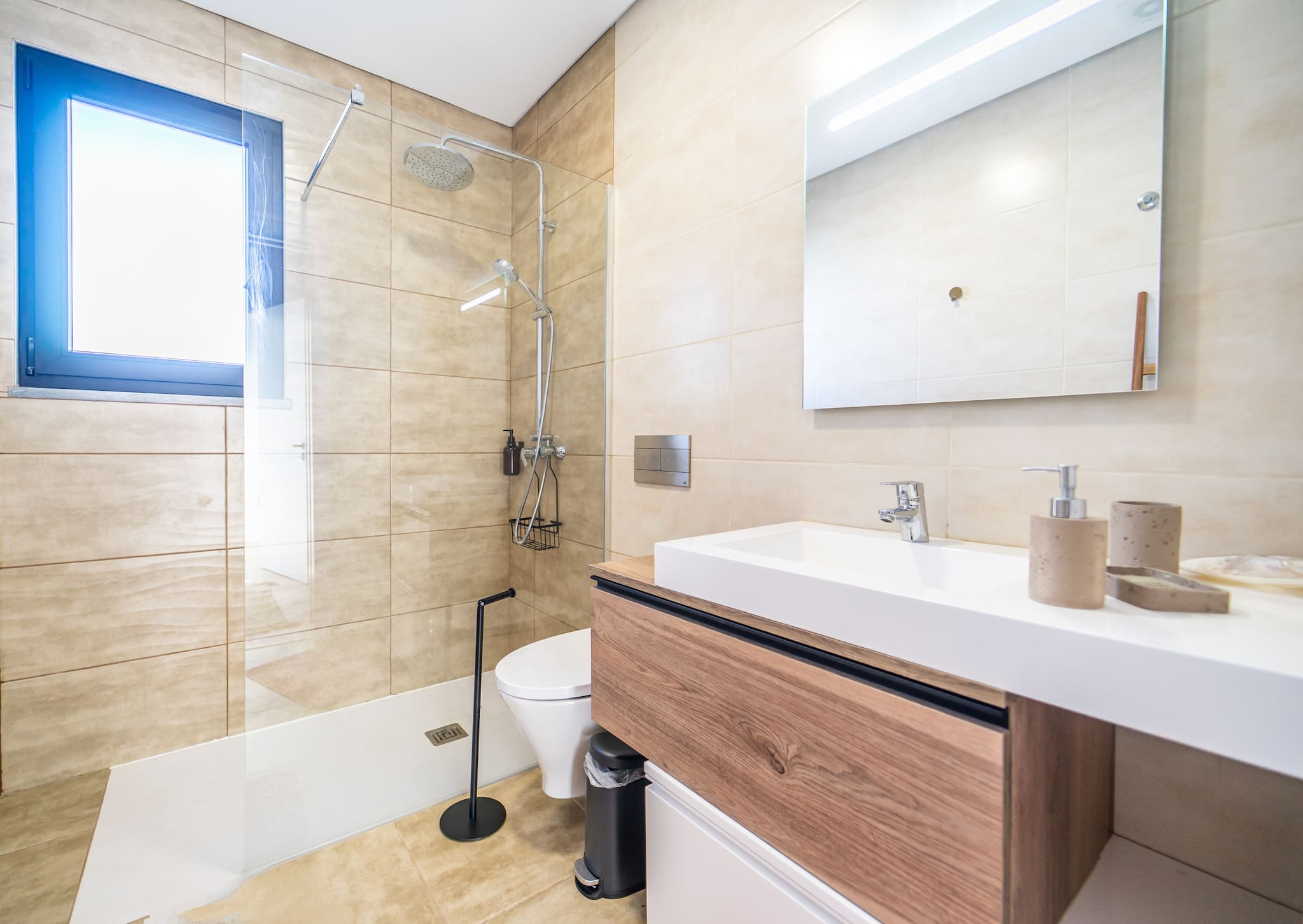 Casa de banho ao ar livre. Desfrute da melhor experiência ao ar livre com a nossa elegante casa de banho e chuveiro ao ar livre, mesmo ao lado da piscina.